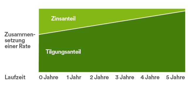 Eine Kreditrate setzt sich zusammen aus einem Tilgungsanteil und einem Zinsanteil. Während der Laufzeit verändert sich das Verhältnis von Tilgungs- und Zinsanteil: Bei gleichbleibender monatlicher Rate verkleinert sich der Zinsanteil zugunsten des Tilgungsanteils.