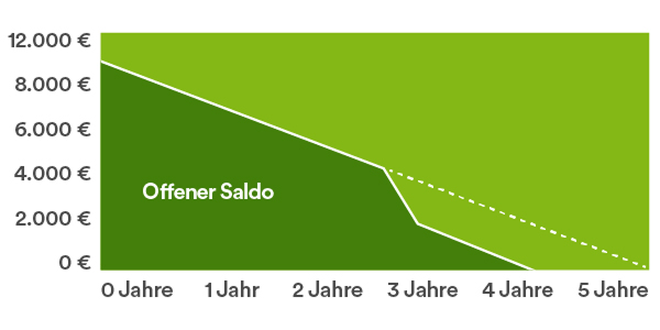 Wir möchten, dass du in Bezug auf deine Finanzen zu jeder Zeit absolut flexibel bist, deshalb sind bei uns kostenlose Sondertilgungen möglich – egal wie häufig. Falls dir finanzielle Mittel zur Verfügung stehen, mit denen du deine Kreditrestschuld reduzieren möchtest, kannst du gerne jederzeit kostenlos eine Sondertilgung vornehmen.